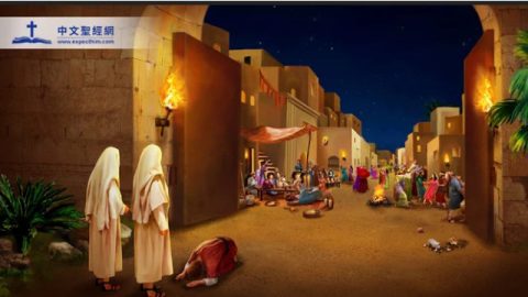 那兩個天使晚上到了所多瑪;羅得正坐在所多瑪城門口,看見他們,就起來迎接,臉伏於地下拜,說:我主啊,請你們到僕人家裡洗洗腳,住一夜,清早起來再走。他們說:不!我們要在街上過夜。羅得...