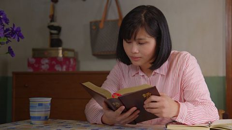 「快看,這是爺爺教我用毛筆寫的第一句經文:『你要盡心、...